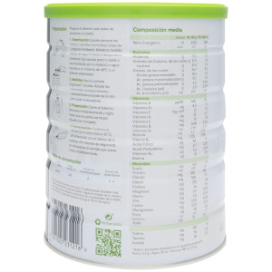 - leche desnatada, jarabe de glucosa, aceites vegetales (oleína de palma, aceite de coco, aceite de soja y aceite de girasol alto en ácido oleico), lactosa (de la leche ), galactooligosacáridos (GOS, de la leche ), polidextrosa, emulgente (lecitina de soja ), carbonato cálcico, aceites de organismos unicelulares (AA de Mortierella alpina y DHA de Crypthecodinium cohnii), L-ascorbato sódico, cloruro de colina, hidróxido potásico, sulfato ferroso, taurina, fosfato magnésico, inositol, citidina 5’-monofosfato, sulfato de zinc, acetato de DL-alfatocoferol, palmitato de ascorbilo, niacinamida, uridina 5’-monofosfato, adenosina 5’-monofosfato, guanosina 5'-monofosfato, pantotenato cálcico, sulfato cúprico, palmitato de vitamina A, riboflavina, clorhidrato de tiamina, colecalciferol, clorhidrato de piridoxina, sulfato de manganeso, ácido fólico, fitomenadiona, yoduro sódico, selenito sódico, D-biotina y cianocobalamina.